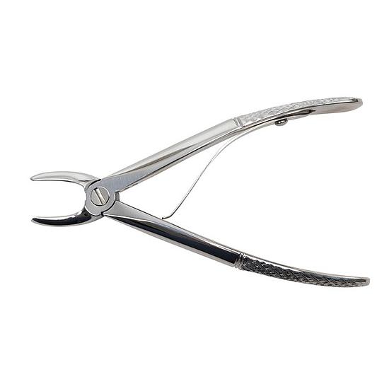 Le davier d'extraction sert à saisir la dent et à la retirer de son alvéole après l'avoir mobilisée. Sa petite taille et le ressort de son manche limitent la force appliquée et le risque de rupture de la dent. Longueur totale 125 mm (5”).