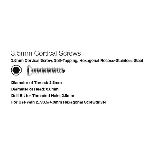 VIS CORTICALE AUTOTARAUDANTE Ø 3,5 MM Ø du filetage : 3,5 mm. Ø du noyau : 2,4 mm. Empreinte hexagonale : 2,5 mm. Ø de la tête : 6,0 mm. Ø de la mèche pour :