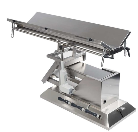Het V-vormige tafelblad biedt optimale positie en elke zijde kan handmatig worden aangepast en vastgezet. Dit model bevat een serumdrager en 4 intrekbare wielen om de tafel moeiteloos te verplaatsen.