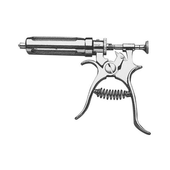 Seringue Luer Lock en métal nickelé. Cylindre en verre. Se remplit par aspiration par l’aiguille, comme une seringue hypodermique. Injection en série de doses prédéterminées.
